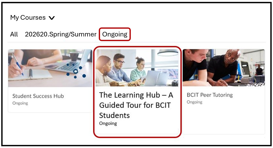 Log into the Learning Hub > scroll down to My Courses > Ongoing > locate the course labeled, Guided Tour for BCIT Students Click on it to enter into the course.