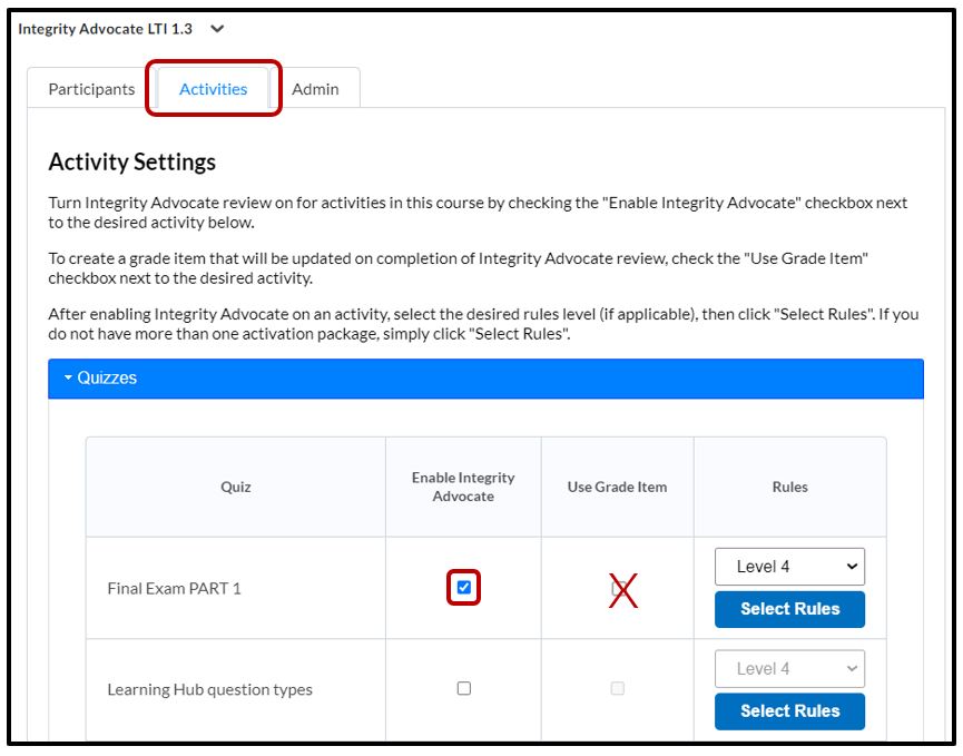 Select the Activities tab of the IA widget. You’ll find a list of all the quizzes in the course. To activate IA for a particular quiz > select the Enable Integrity Advocate box for that quiz.