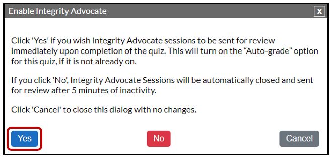Select No to Enable Integrity Advocate without turning on ‘Grade and publish results automatically’