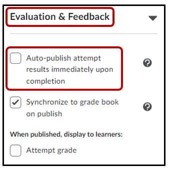 • Once Integrity Advocate is enable for the quiz, under the Evaluation & Feedback area of the quiz settings, the Auto-publish attempt results immediately upon completion will be selected