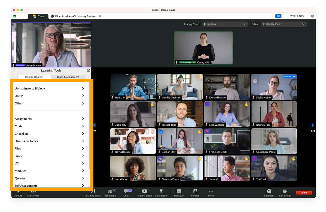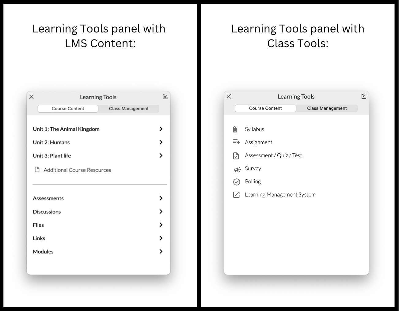 4. Use the Learning Tools choice menu to switch between LMS content and the native Class tools
