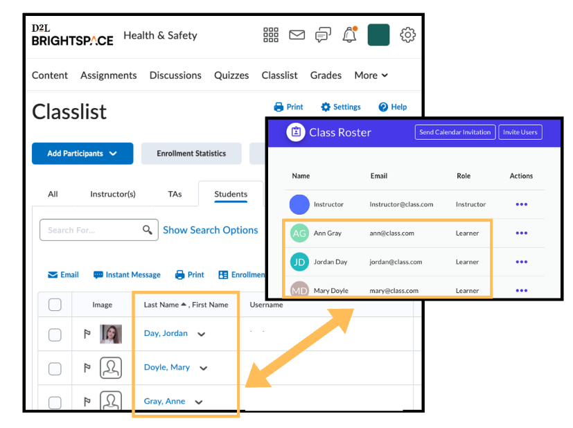 The ELMS integration pulls the list of learners from the Classlist in your Learning Hub course, and automatically adds them to the Class Roster. This means that: