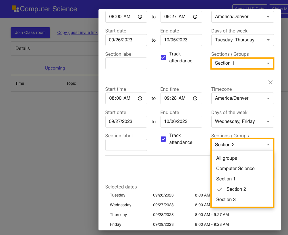 When you designate the times your course meets, you may attribute a section to each time. Class will only track attendance and engagement for learners in the designated section. Learners will only see recordings for classes that match their section. Depending on your configuration, learners may only see the option to join your Class during their section time.