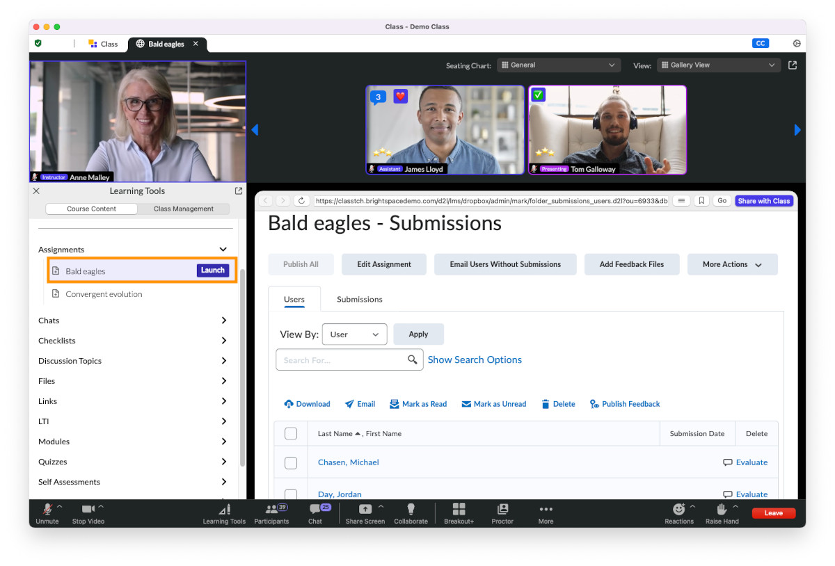 After you share the content, you’ll see the instructor view, and your learners will see the learner view. For example, if you launch a quiz, the instructor can see submissions and edit controls, whereas each learner can see and take their quiz.