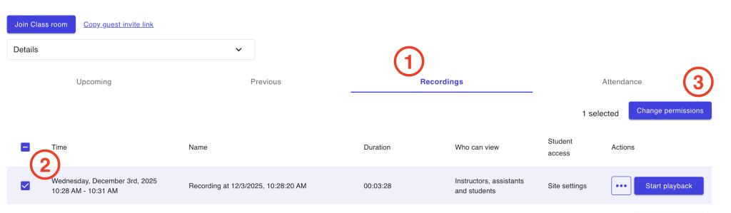After recording, the playback will appear under the Recordings tab in the CfT dashboard. By default, recordings are only visible to participants who attended the session. To make the recording available to all students:
