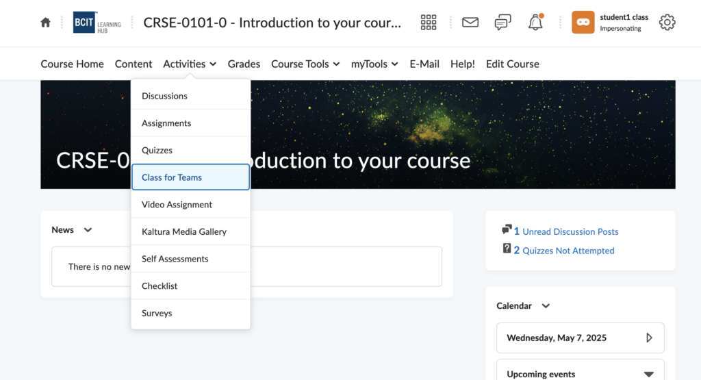 Anyone accessing Class for Teams at BCIT should do so through the Learning Hub, using the Activities > Class for Teams option in the course navigation bar. This method ensures that only individuals enrolled in the course Classlist have access to the associated Class for Teams session.