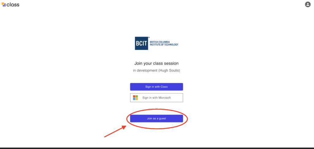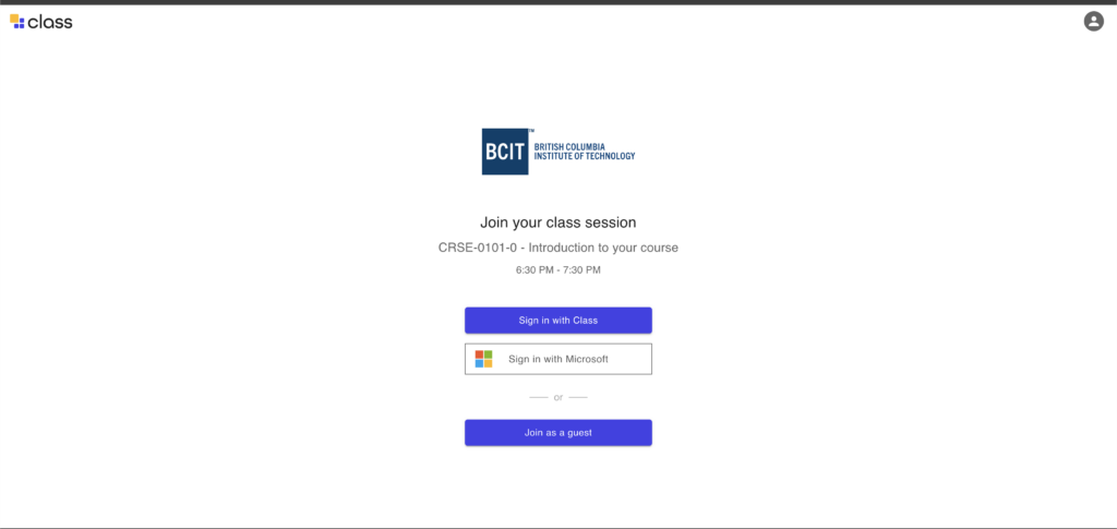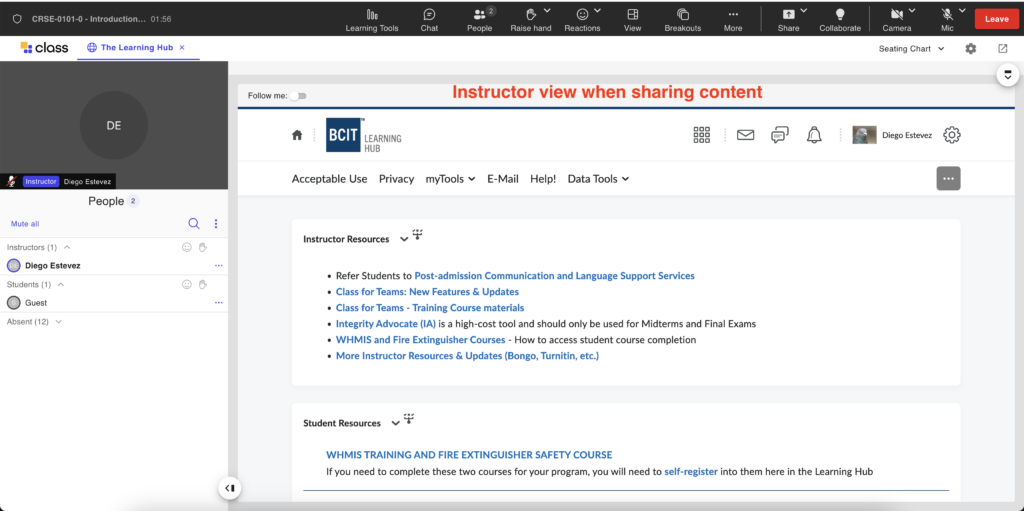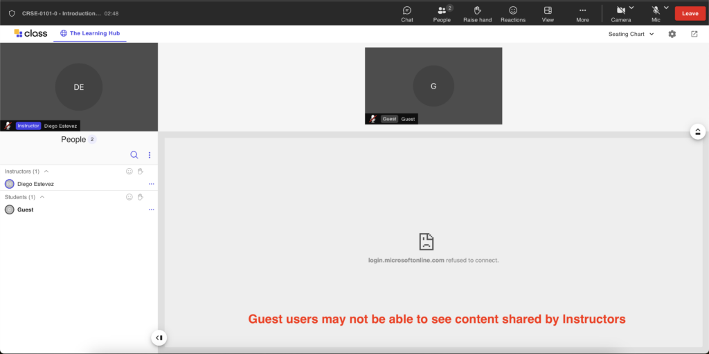 Guests who join a Class for Teams session with the Guest role cannot share their screen or content, have limited use of the chat feature, and may not be able to view or interact with contentthat requires BCIT Single Sign-On (SSO) authentication (e.g., content from the Learning Hub). More importantly, instructors cannot modify users with the Guest role to a Student or Instructor within Class for Teams.