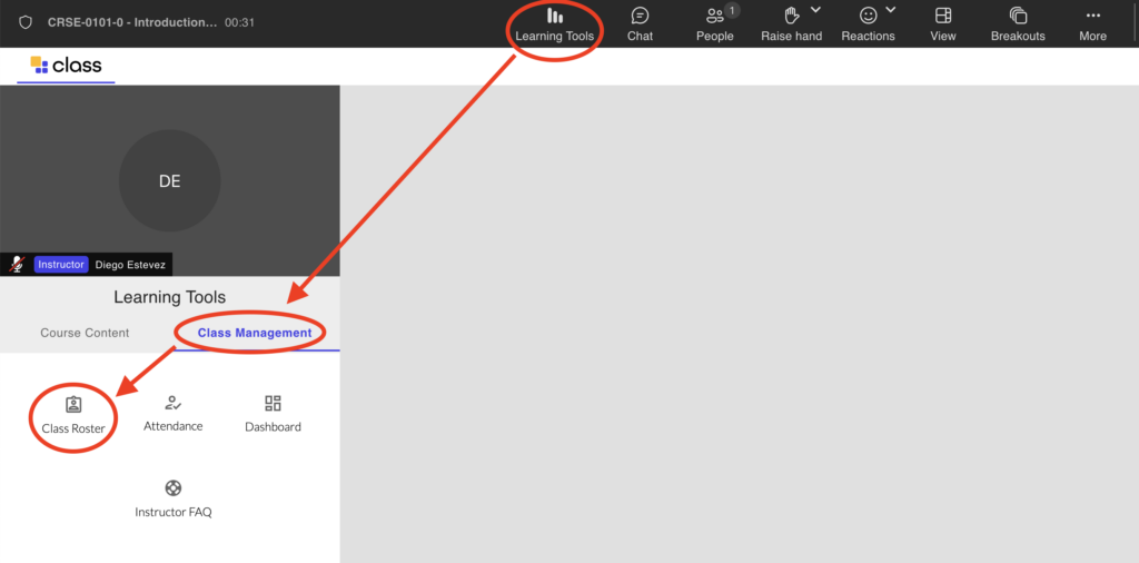 Next, click on Learning Tools in the top navigation bar. Then click on Class Management, followed by Class Roster.