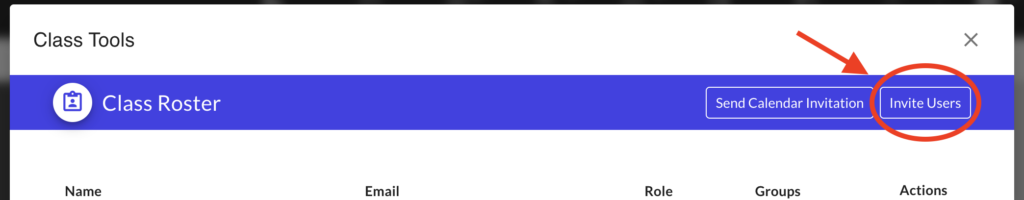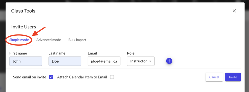 Click the Invite Users button. Under the Simple Mode tab, enter your guest’s first name, last name, and email address. Assign them either the Student or Instructor role, and check the box labeled Send email on invite (you can leave the other option unchecked). Then, click Invite.
