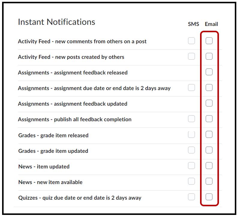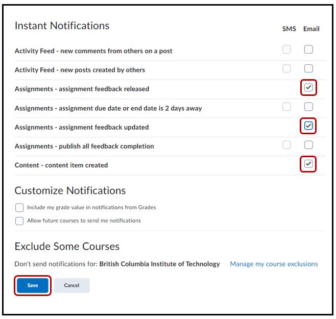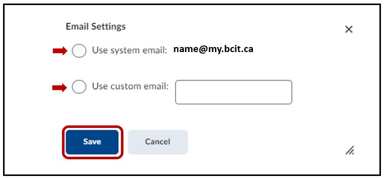 Select Enable email notifications > select the default student @my.bcit.ca email address or enter a custom email address > Save