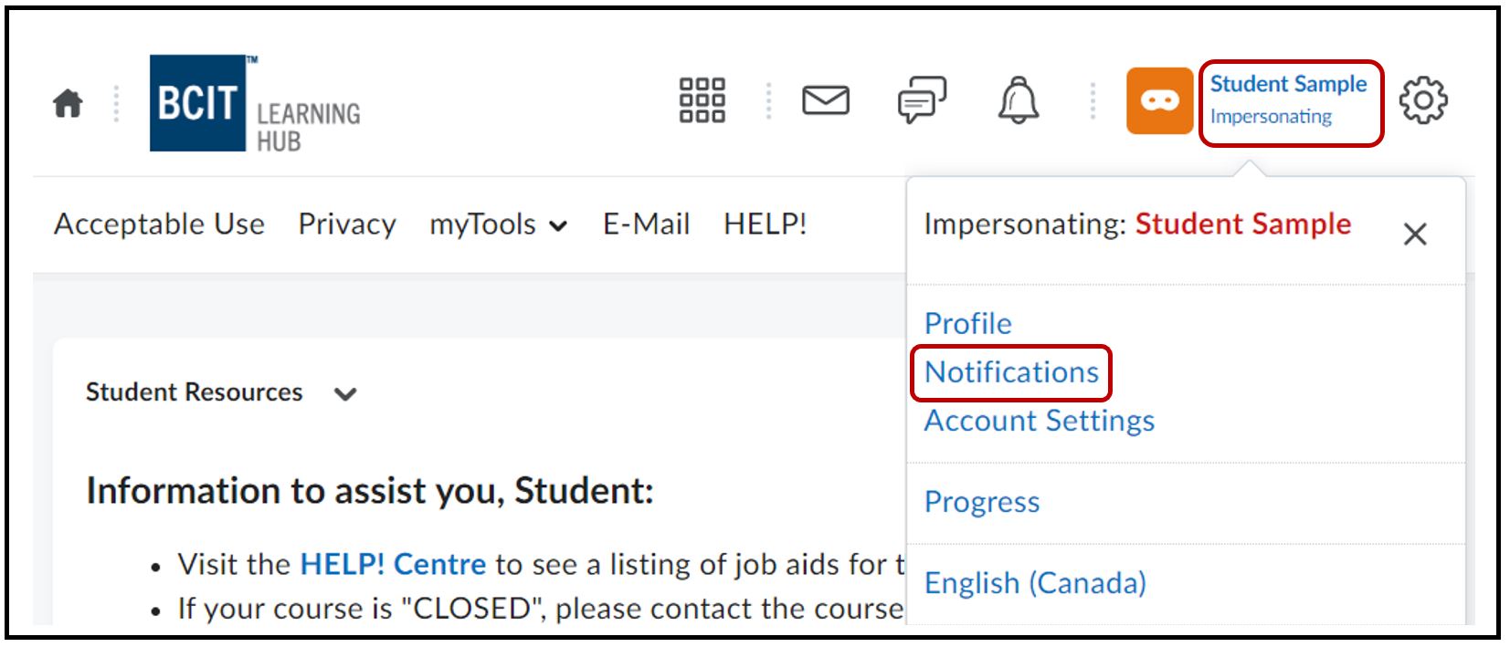 To access the Notifications Menu > log into the Learning Hub > click on your name at the top right > Notifications
