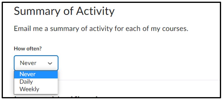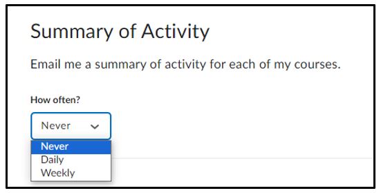 Select How Often you want receive notifications > Never, Daily , Weekly. Depending on your choice, you will have the option to select the time (Daily) or the time and day (weekly) of when you receive notifications.