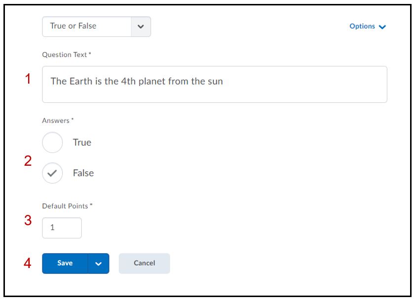 True or False questions require learners to determine if a statement is correct or incorrect. To begin, choose True or False from the dropdown menu