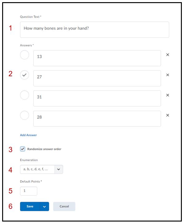 - Select Randomize answer order (if desired), this will randomize answer choices to learners while taking the quiz