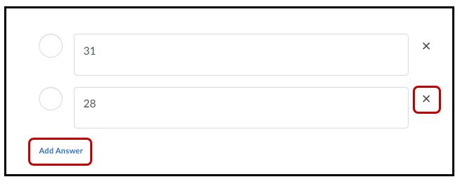 Selecting Add Answer will create another field to include another answer choice field. Selecting the ‘x‘ will delete the answer field.