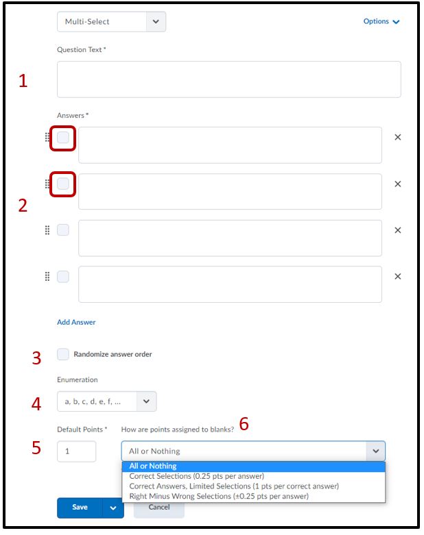 - Points are evenly distributed across all answers. Learners earn partial points for each answer correctly selected and left blank. Learners lose points for answers incorrectly selected or left blank. Learners cannot receive less than 0 points.