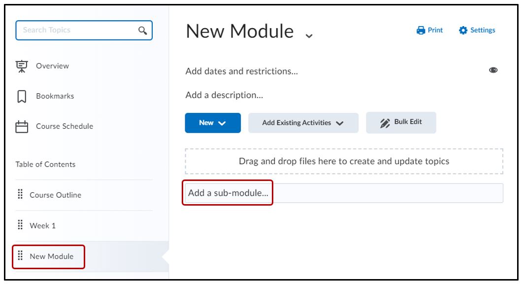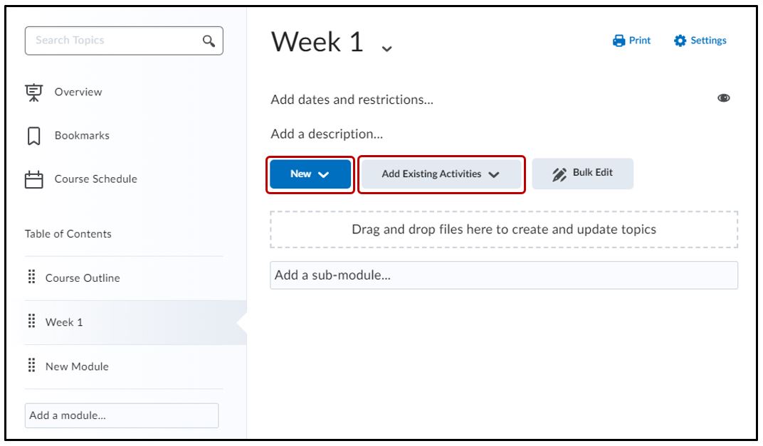 Content can be added to the module by clicking on either the New or Add Existing Activities buttons inside the module or sub-module