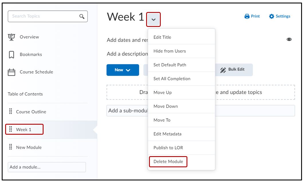 To delete a Module, click on the Module name on the left side (Table of Contents) > click on the drop down menu beside the Module > Delete Module