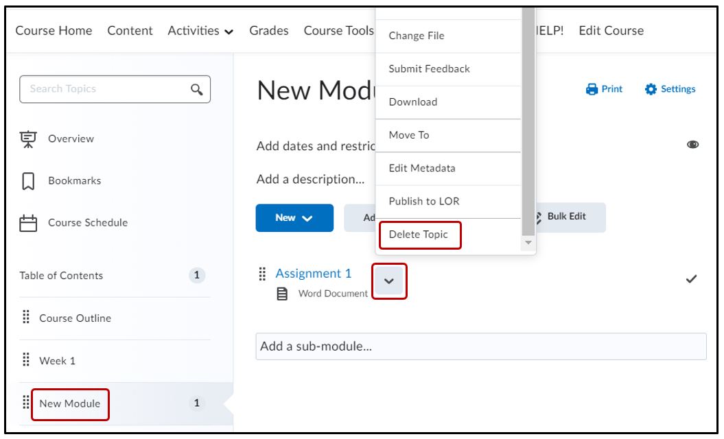To delete a topic or file from within a Module (or sub-module), click on the Module name on the left side (Table of Contents). Next, find the topic/file you with to delete and next to it’s title click on the dropdown menu > Delete Topic