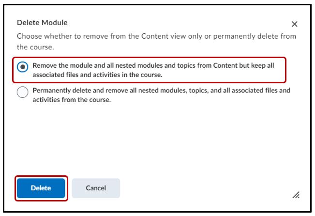2. Permanently delete and remove all nested modules, topics, and all associated files and activities from the course.