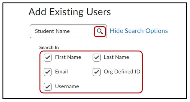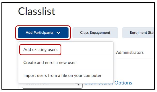 Under the subheading that says Add existing users search for the user that you would like to add to the course. You can filter your search results by ticking the checkboxes either on or off. Once entered either press Enter or the magnifying icon to search