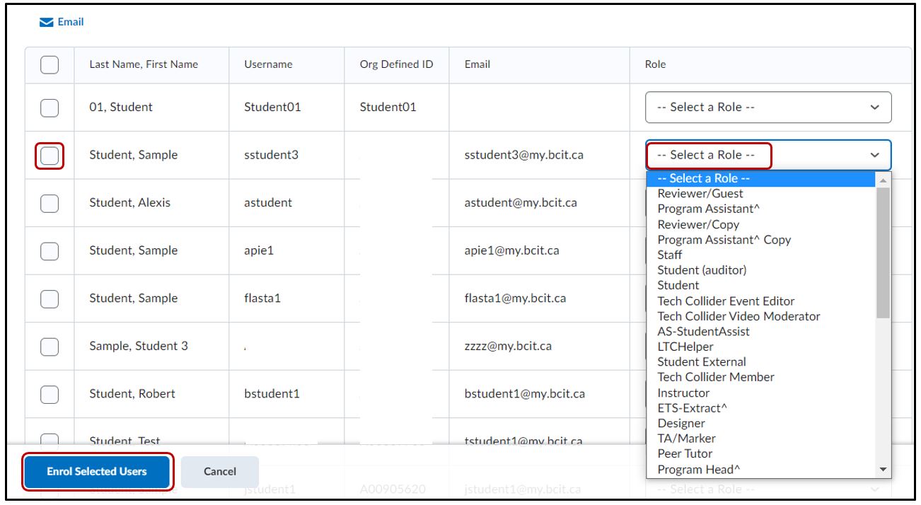 To add a specific individual to your course, tick the checkbox on the leftmost column and under the Role column select the role you wish the individual to have in this course. Once you are finished click on the blue button Enrol Selected Users below to enroll the individual in the course.