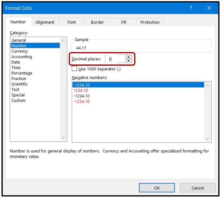 In the Format Cells windows, select Number, then change the decimal to 0 places > OK