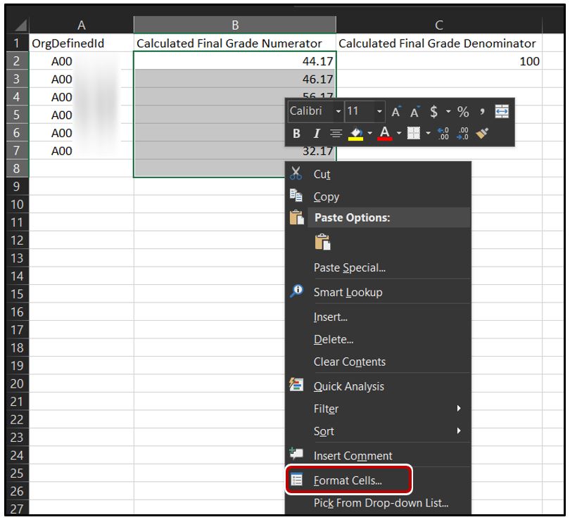 Unfortunately, you can’t have any decimals like in the example below. Just highlight and right click on the calculated grades column and select Format Cells