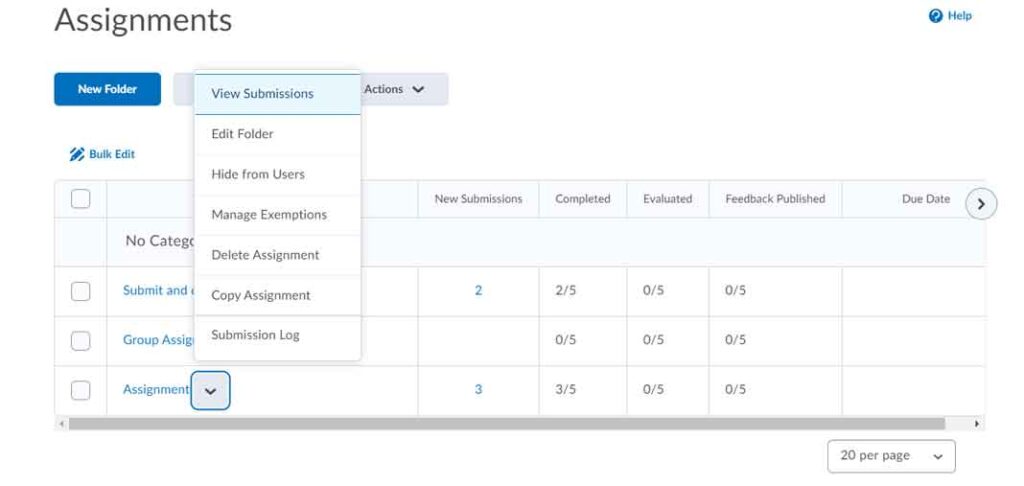 Next, find the desired assignment and the click dropdown arrow next to it. Click View Submissions to see what the students have submitted.