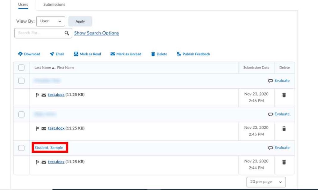Here you should see a list of all of the students who have currently submitted something. Click on the students name to reveal what they have submitted as well as evaluate them.