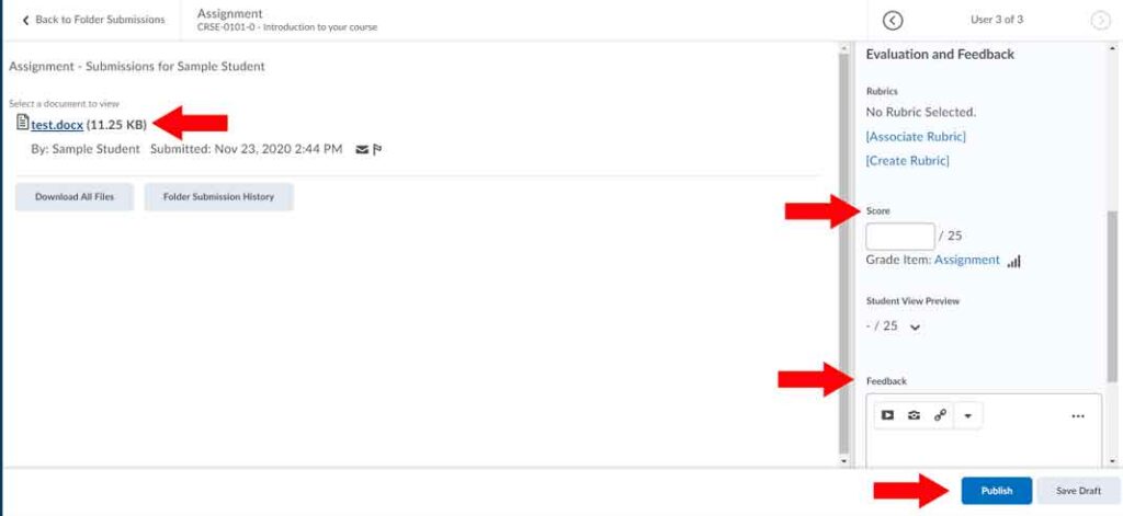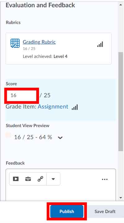 On the right side you will see where you can evaluate the student and give them feedback. Click Publish to send the marks off to the Grades Tool where students can see them