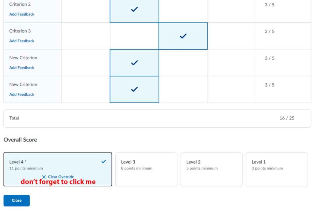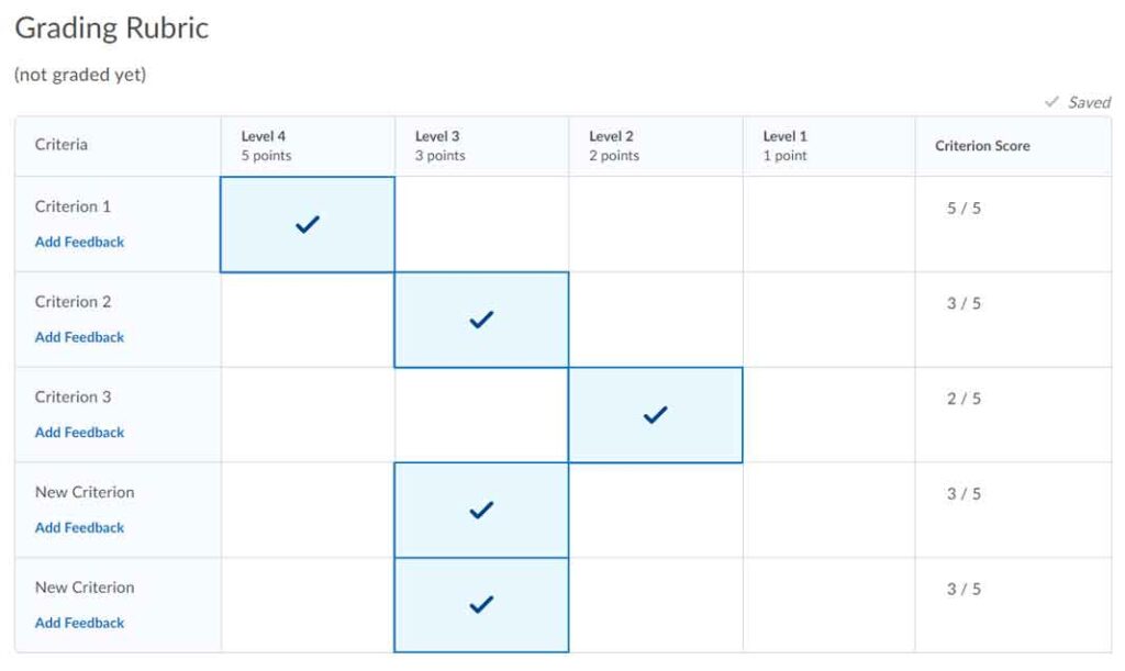 Click on this to open a popup window with the rubric viewer. Now click on a box under a column for each criterion. You can also add feedback by clicking on “Add feedback” underneath each criterion.