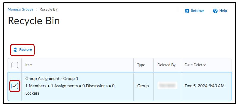 A new Recycle Bin option is available in the Groups tool, enabling you to restore individual group units or entire categories within a course offering. When you restore groups, existing enrollments and lockers are also reinstated (if present). Any activities linked to the restored groups, such as discussions or assignments, can then be individually restored through their respective restore pages.