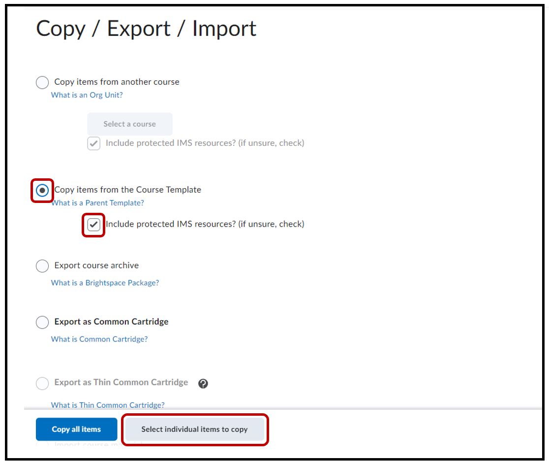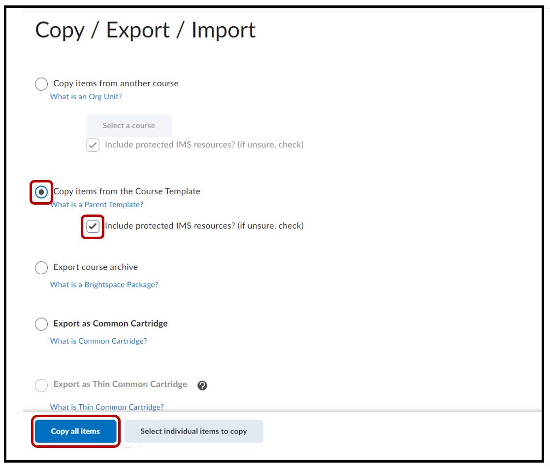 Select the radio button Copy items from the Course Template > make sure the Include protected IMS resources option is selected > Copy all items