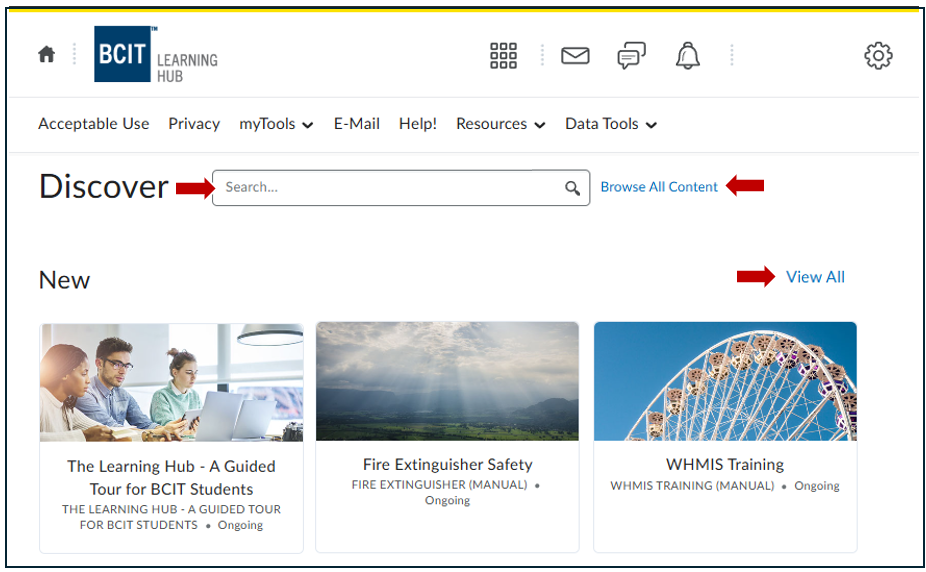 Log into the Learning Hub using your BCIT email address and password. From the navigation bar, select myTools > Discover