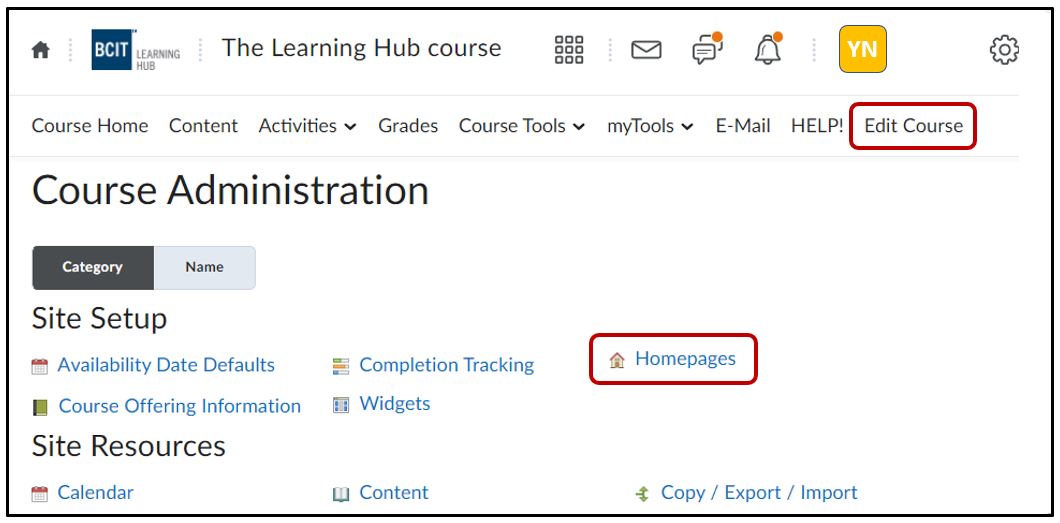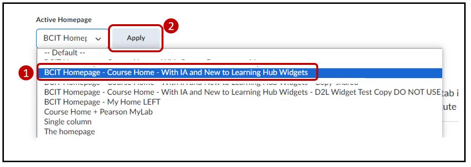 Click the dropdown menu under Active Homepage, choose BCIT Homepage – Course Home – With IA and New to Learning Hub Widgets > Apply.
