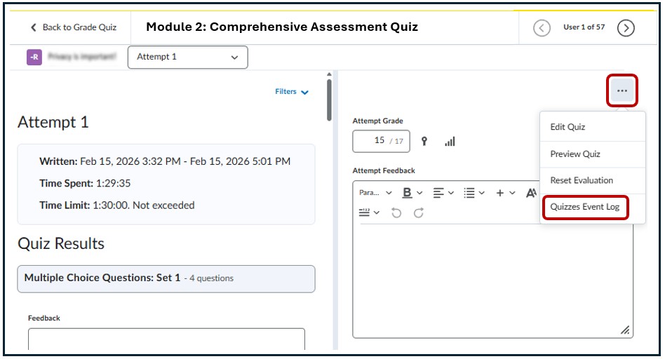 If you wish to see the individual times that students have logged into or answered questions on an online quiz, or if you want to make sure that students did not cheat by using the same computer at the same time, then you will need to access the Quiz Event Log.