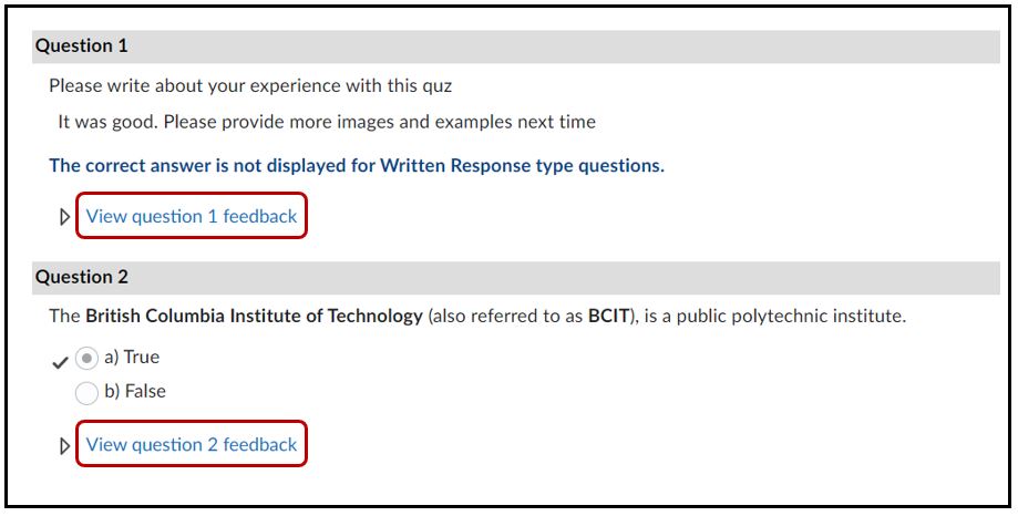 If there is feedback for a question, select the “feedback” link at the bottom of each question. Click on it to view any feedback.