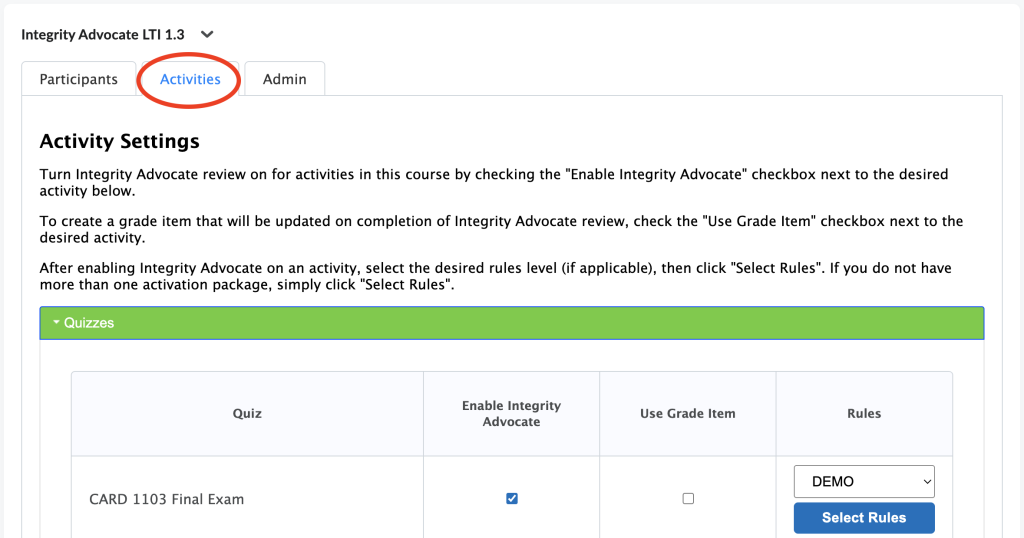 - In the Rules column, select DEMO to set this quiz to run IA in demo mode.