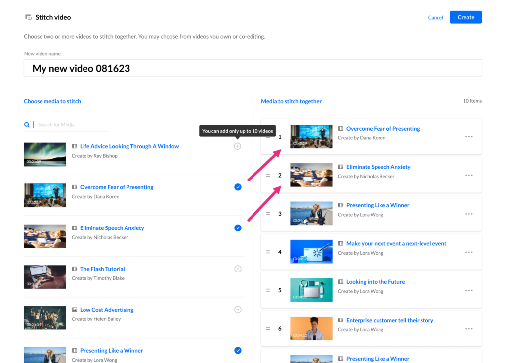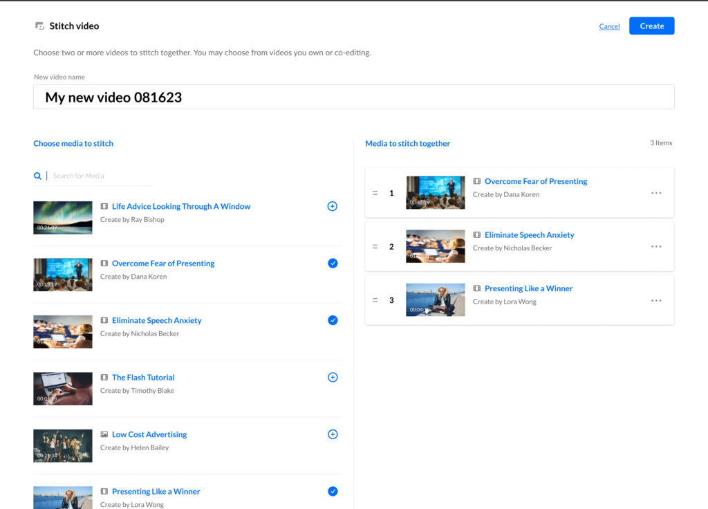 In the Choose media to stitch section, choose the media that you want to stitch together by clicking the add buttonsnext to the items (if you have a long list, you can use the Search option to locate items).