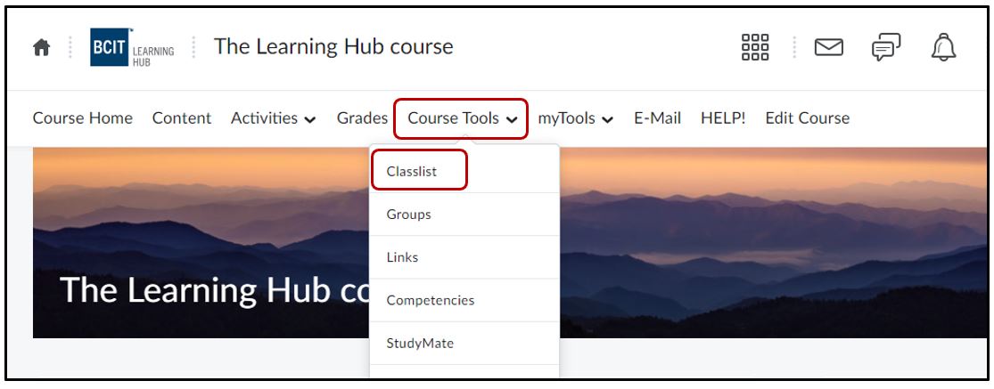 To access the class list tool, login to the Learning Hub > open a course > select Course Tools > Classlist