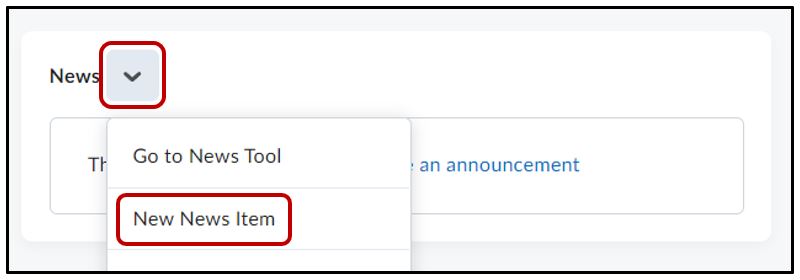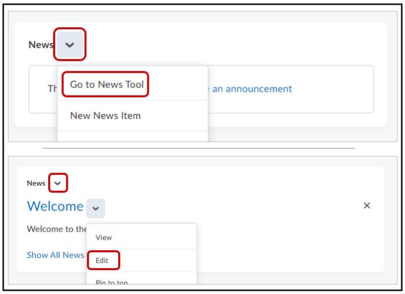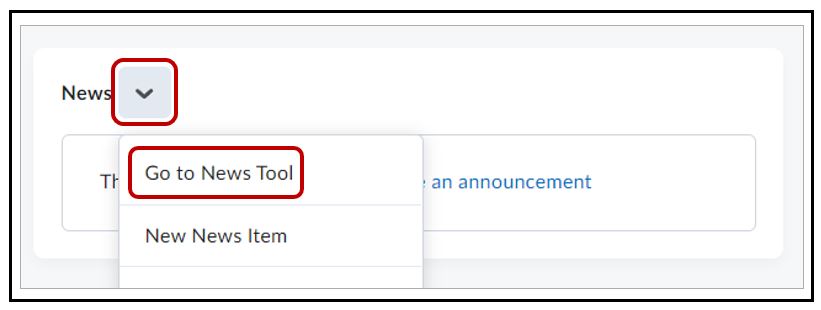 To edit a News Item after it has been created you can do one of two things: click the dropdown beside News > Go to News Tool or select the dropdown beside the specific news item on your course page > Edit