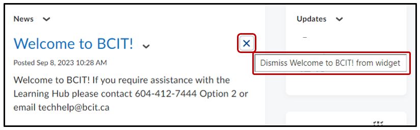 Selecting the X beside the News item will dismiss or hide it from you only. If you are an instructor and have dismissed a News item, that News item will still appear to students.