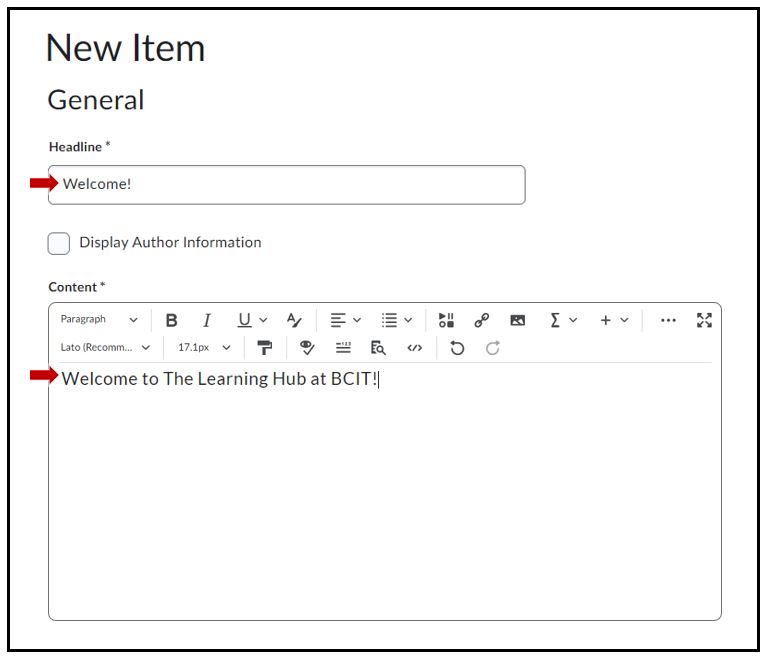 In the Headline field, enter a title for your news item. In the Content box, compose your announcement.