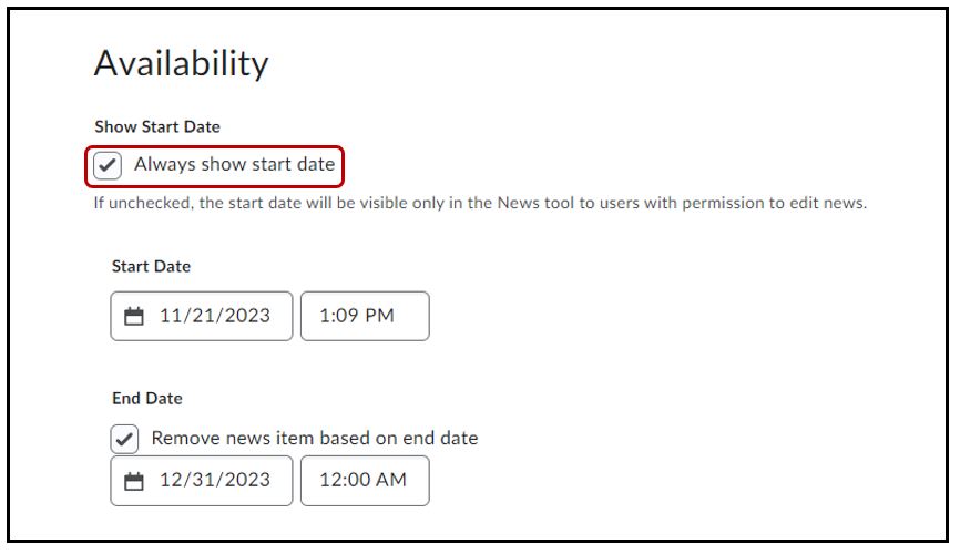 Selecting Always show start date will display the date the news item was created and will be visible to students. If copying News items from previous term courses, remember to either deselect this option or change the start/end date. Enter a Start Date or End Date to allow your news item to appear or disappear on/after a specific date.