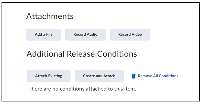 You can also upload a file (eg. PDF, word) or an audio/video recording under the Attachments section inside your News Item for students to download. Setting a Release Condition will allow you to hide the News item until the student fulfills the release condition like completing a quiz or being enrolled in a certain group.