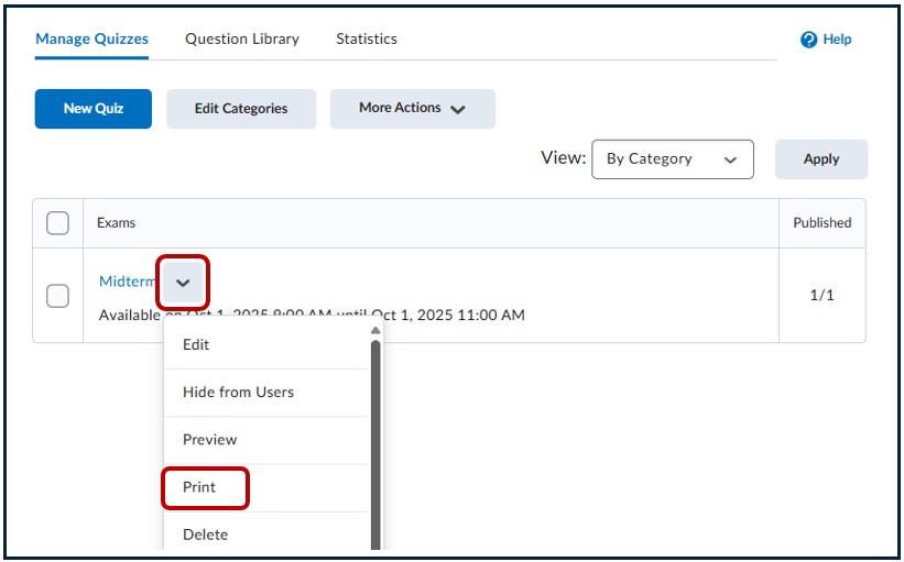 1. From the Manage Quizzes page, click the drop-down beside the quiz name and select the Print option.