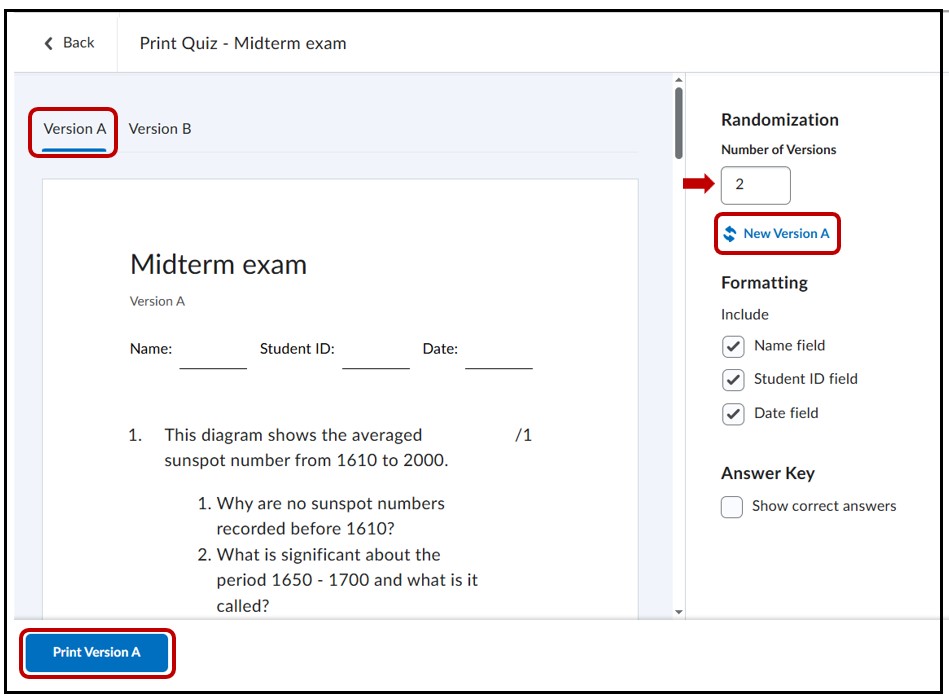 • Selecting new randomization or a specific New Version (for example, Version A) triggers a new random set of questions from the pools.