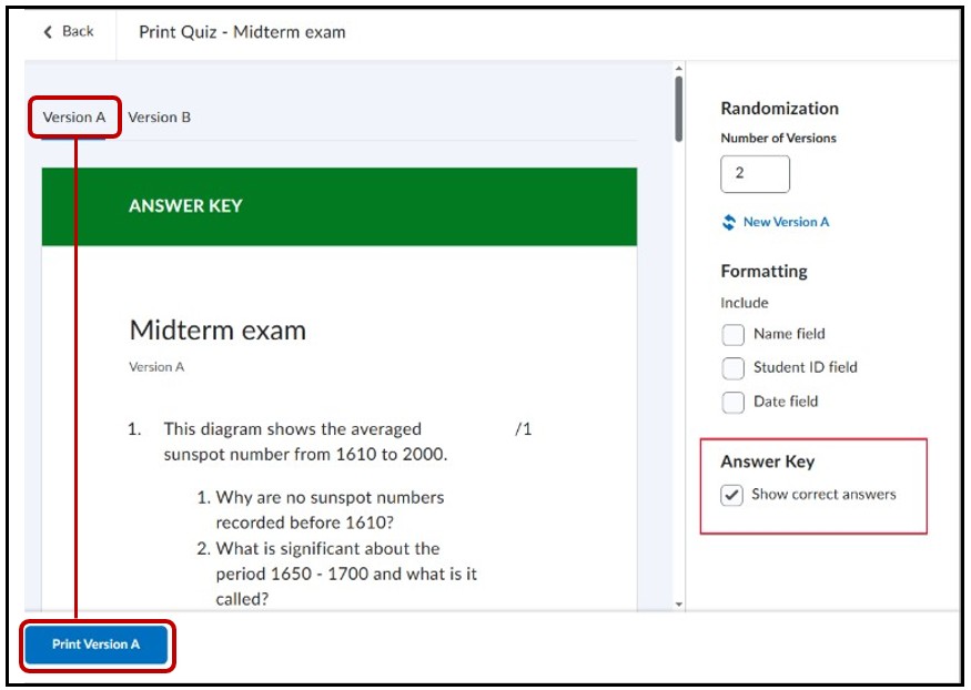 To grade a quiz, instructors can select Show correct answers and print the required version of the quiz with an Answer Key.